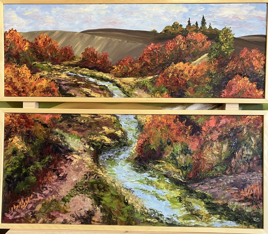 Fall along Hangman Creek, Tekoa, WA (2025), diptych of two birch plywood cradled panels – oil – 24″x28″: $700
